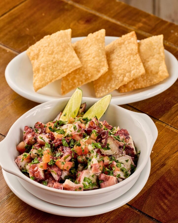 Para acompanhar os drinks, o cardápio ganha reforços pensados para o centro da mesa. Entre as novas pedidas estão o polvo à vinagrete com pasteizinhos de vento (R$ 125,90), o dadinho de tapioca com geleia de pimenta e abacaxi (R$ 34,90) e os mini burgers (R$ 45,90 – seis unidades). Nos pratos principais, entram o galeto à moda da Gávea (R$ 133,50), servido com arroz de brócolis, farofa de ovos com banana, batata portuguesa e vinagrete, e o estrogonofe de camarão (R$ 149,90), acompanhado de arroz branco e fritas.